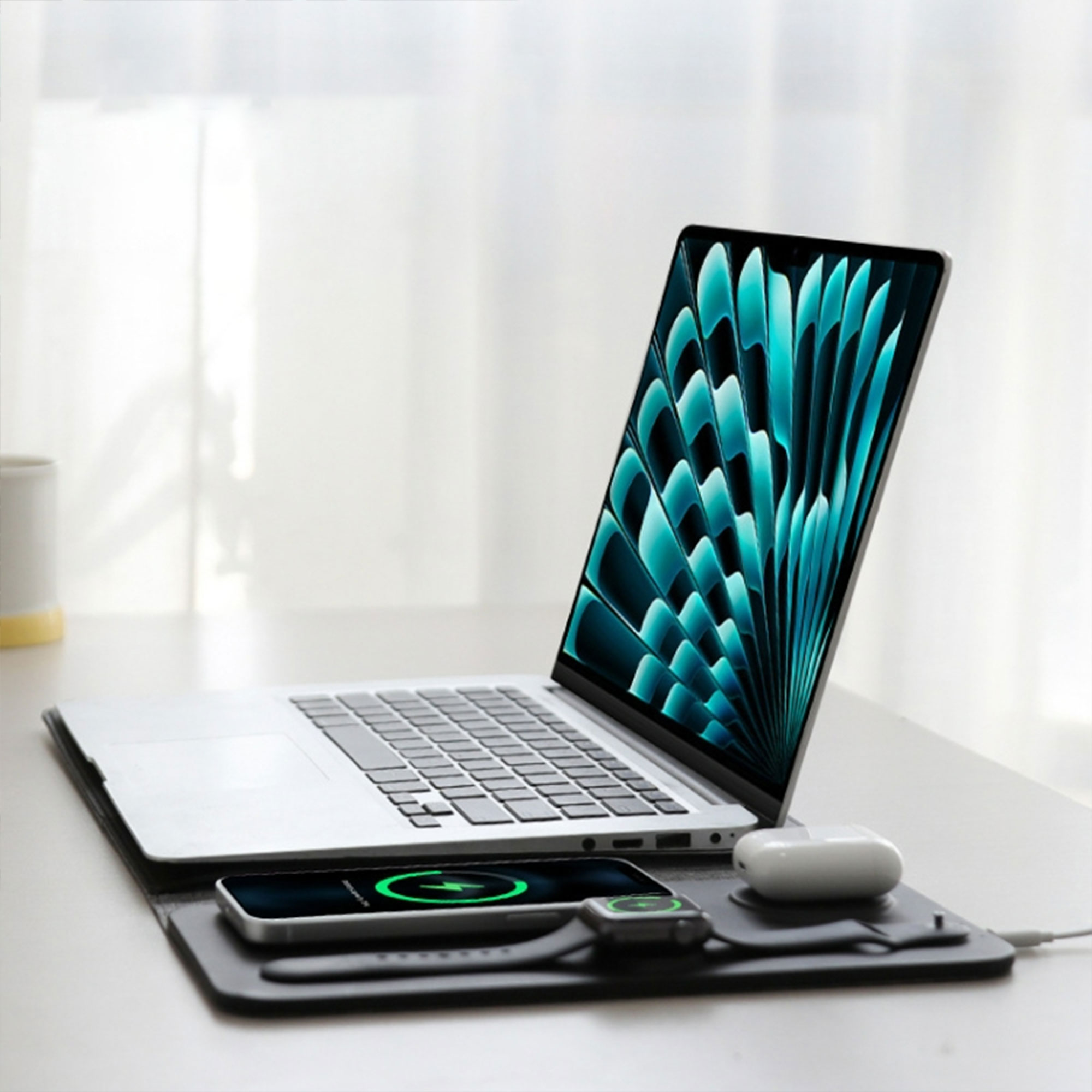 – اشحن أجهزتك كلها في وقت واحد مع حافظة لابتوب بشاحن لاسلكي تقدر تشحن ساعة وسماعة ولابتوب، لا تفوتك.