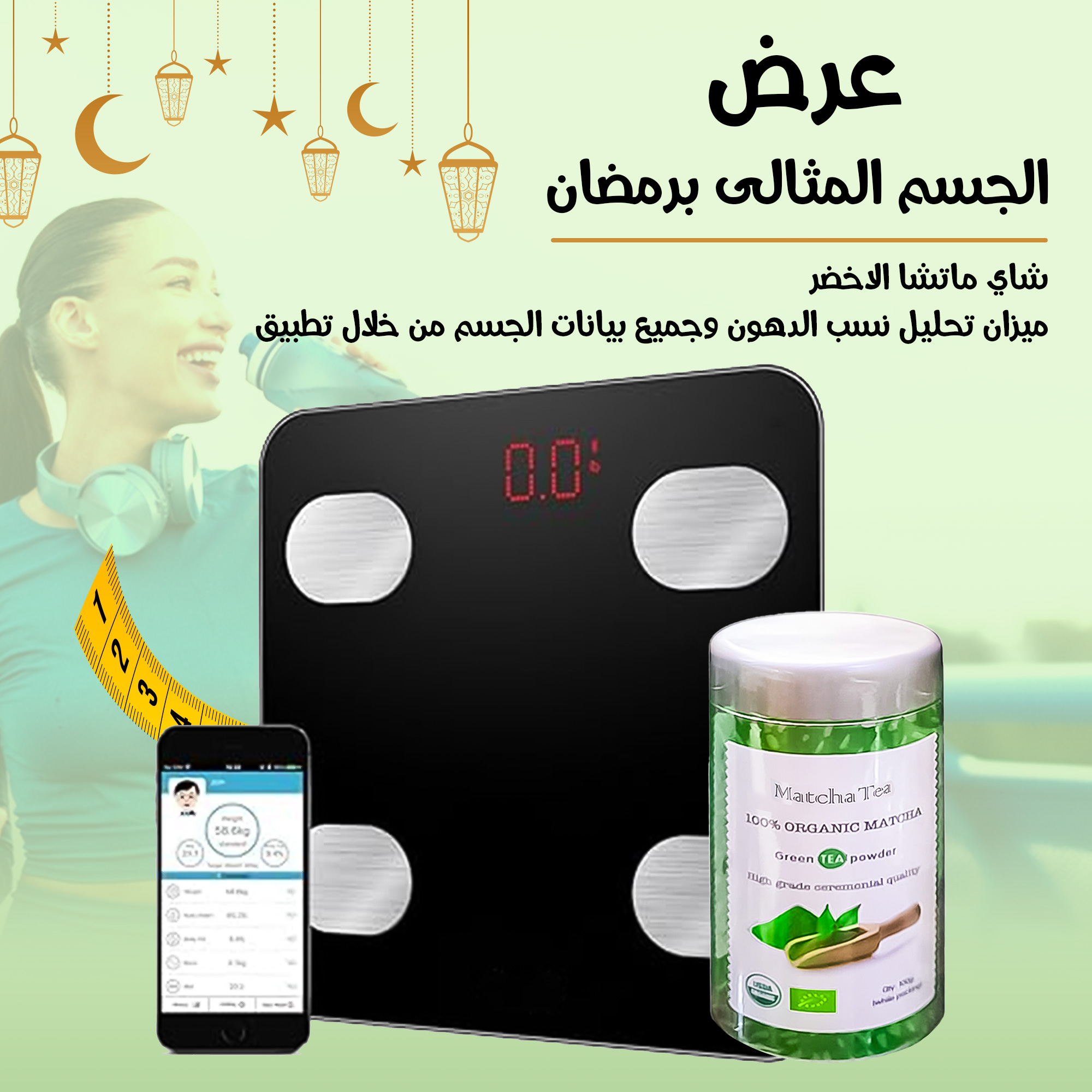 ### **وصف المنتج: شاي ماتشا الأخضر وميزان تحليل نسب الدهون الذكي – حلاً شاملًا للصحة واللياقة**